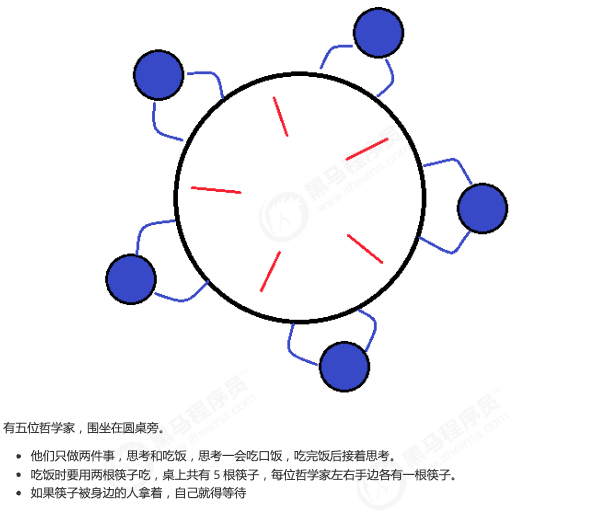1 2 3 4 5 new Philosopher ("苏格拉底" , c1, c2).start(); new Philosopher ("柏拉图" , c2, c3).start(); new Philosopher ("亚里士多德" , c3, c4).start(); new Philosopher ("赫拉克利特" , c4, c5).start(); new Philosopher ("阿基米德" , c1, c5).start();