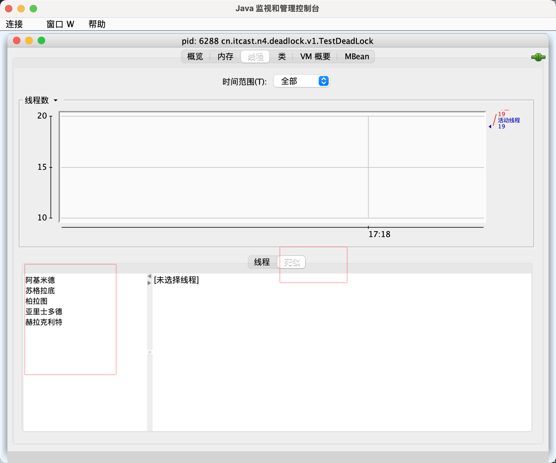 1 2 3 4 5 6 7 8 9 10 11 12 13 14 15 16 17 18 19 20 21 22 23 24 25 26 27 28 29 30 31 32 33 34 35 36 37 38 39 40 41 42 43 44 45 46 47 48 49 50 51 52 53 54 55 56 57 58 59 60 public class TestDeadLock { public static void main (String[] args) { Chopstick c1 = new Chopstick ("1" ); Chopstick c2 = new Chopstick ("2" ); Chopstick c3 = new Chopstick ("3" ); Chopstick c4 = new Chopstick ("4" ); Chopstick c5 = new Chopstick ("5" ); new Philosopher ("苏格拉底" , c1, c2).start(); new Philosopher ("柏拉图" , c2, c3).start(); new Philosopher ("亚里士多德" , c3, c4).start(); new Philosopher ("赫拉克利特" , c4, c5).start(); new Philosopher ("阿基米德" , c5, c1).start(); } } @Slf4j(topic = "c.Philosopher") class Philosopher extends Thread { Chopstick left; Chopstick right; public Philosopher (String name, Chopstick left, Chopstick right) { super (name); this .left = left; this .right = right; } @Override public void run () { while (true ) { synchronized (right) { eat(); } } } } Random random = new Random (); private void eat () { log.debug("eating..." ); Sleeper.sleep(0.5 ); } } class Chopstick { String name; public Chopstick (String name) { this .name = name; } @Override public String toString () { return "筷子{" + name + '}' ; } }