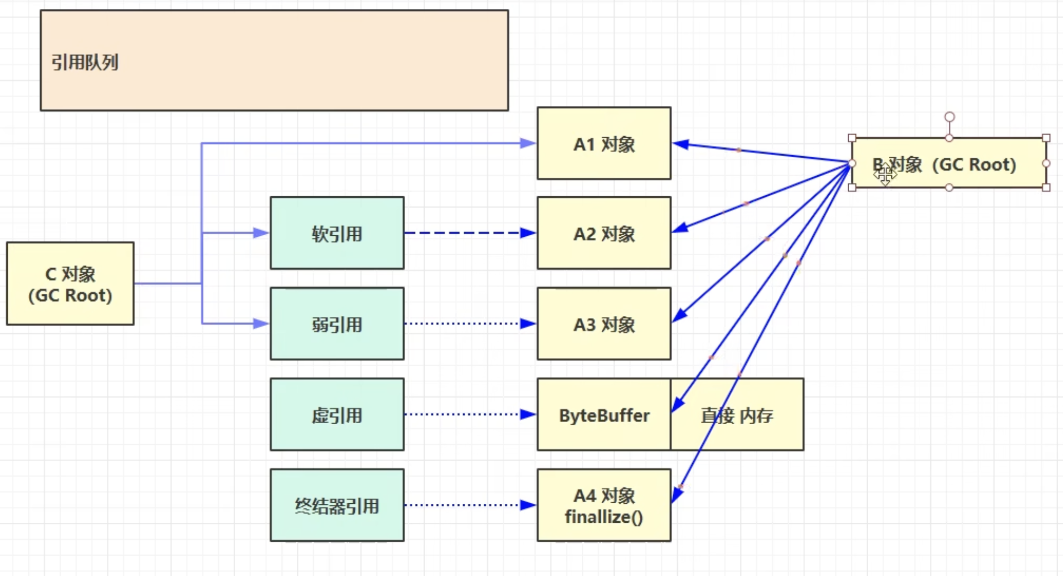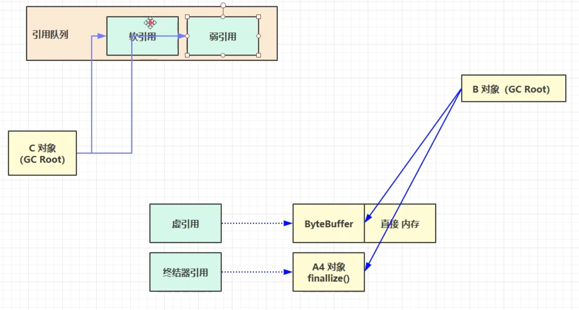 虚引用(PhantomReference)- 必须配合引用队列使用,主要配合 ByteBuffer 使用,被引用对象回收时,会将虚引用入队, 由 Reference Handler 线程调用虚引用相关方法释放直接内存