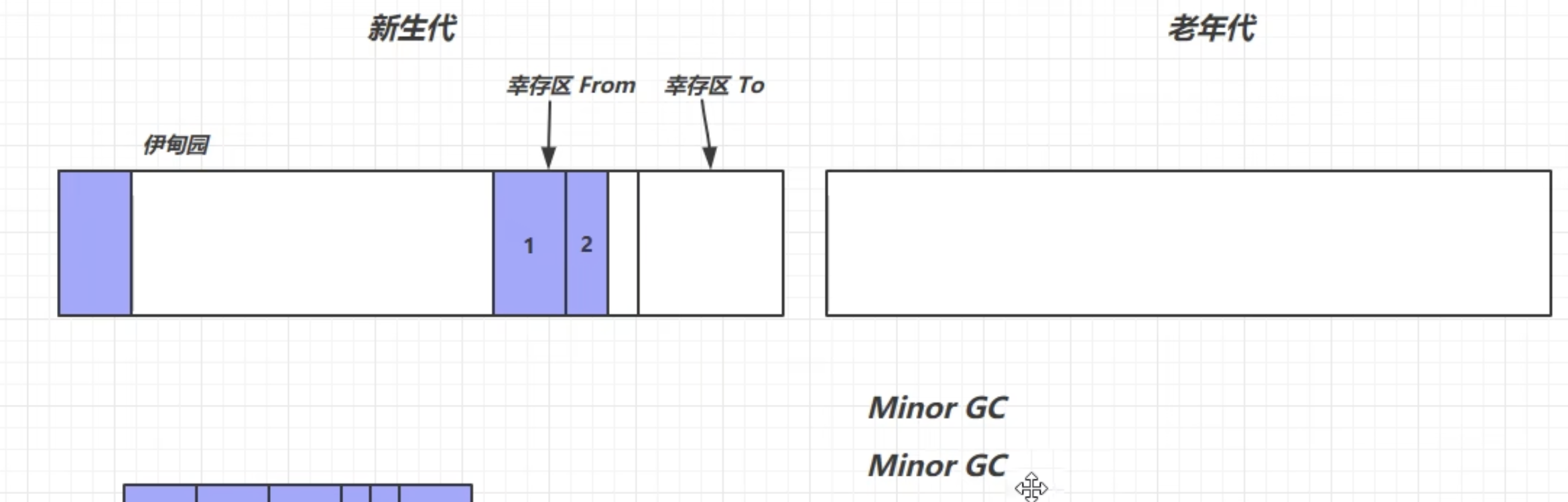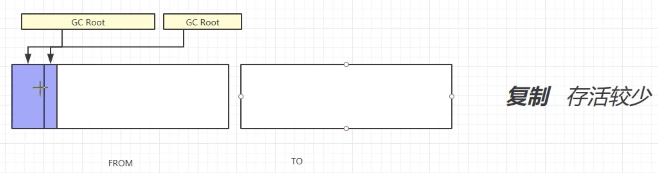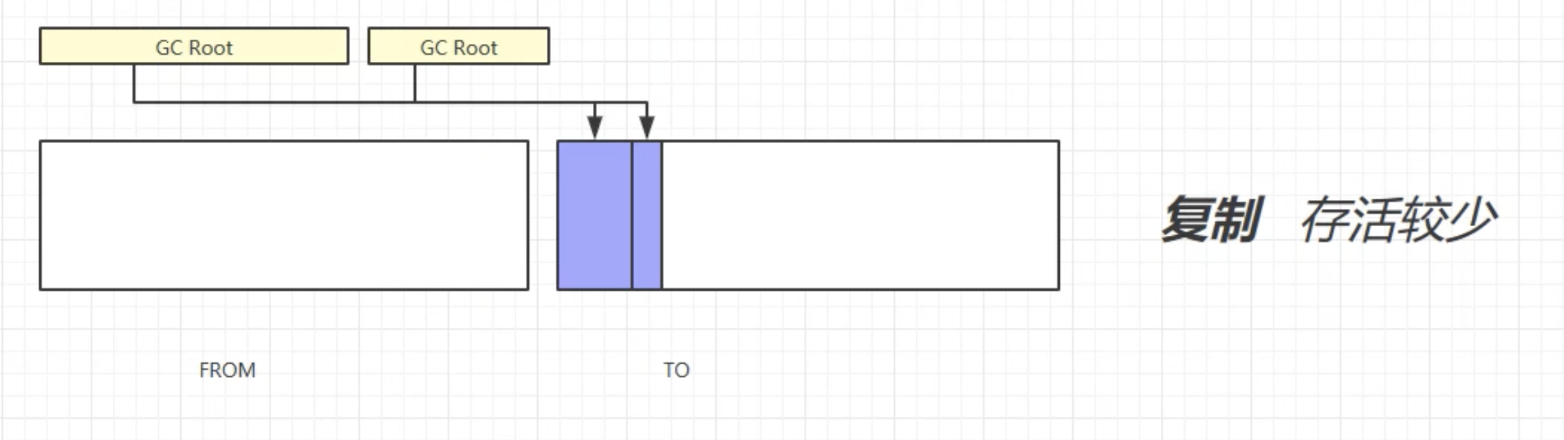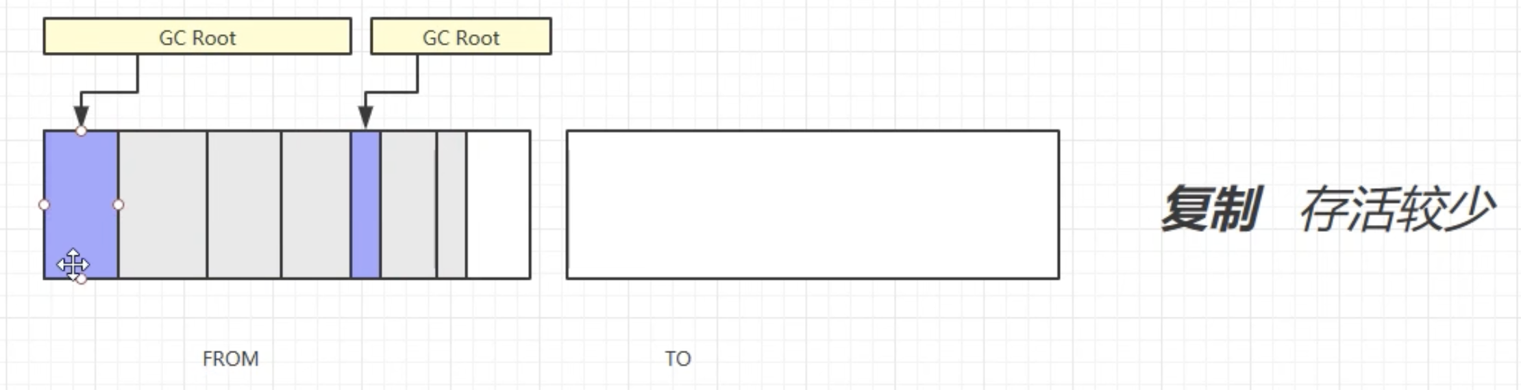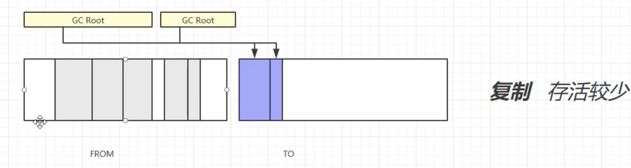 minor gc,伊甸园和 from存活的对象使用copy 复制到幸存区to中,存活的 对象年龄加 1并且交换from和to第二次
