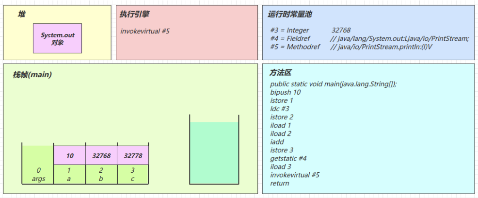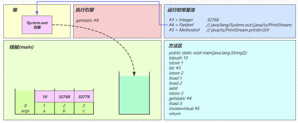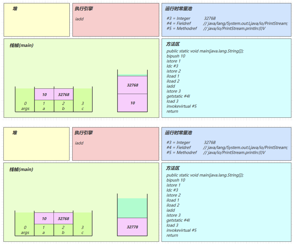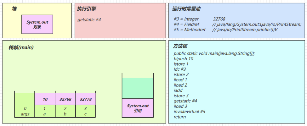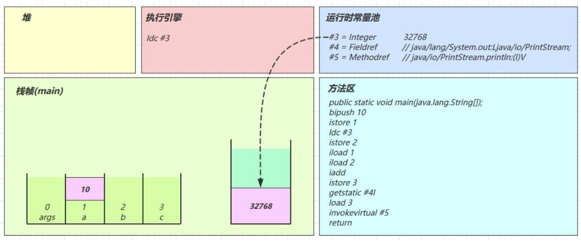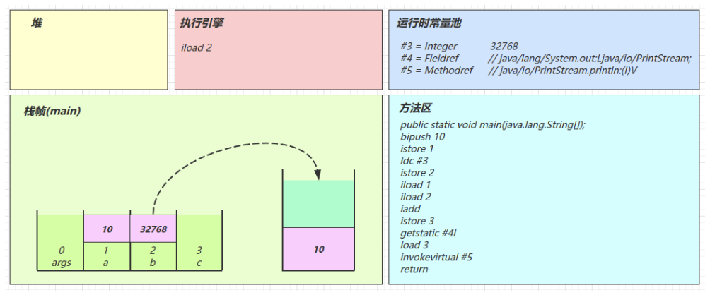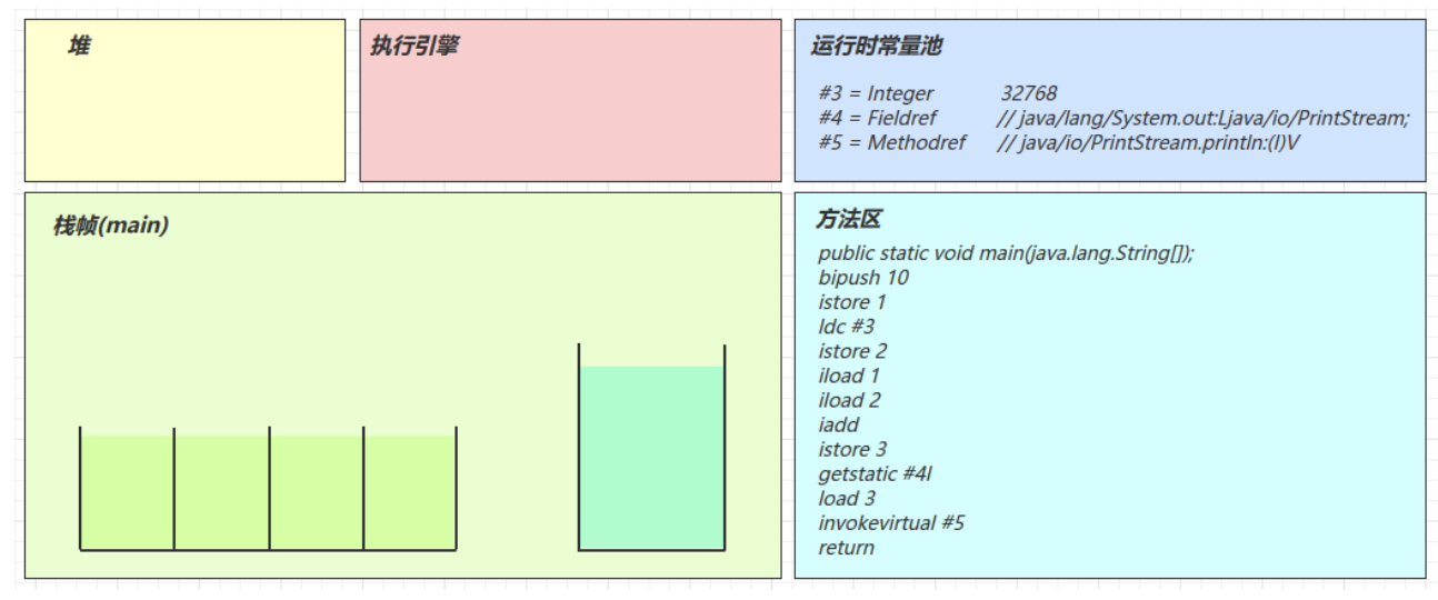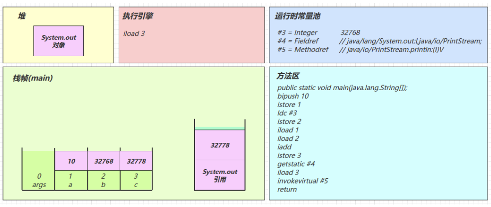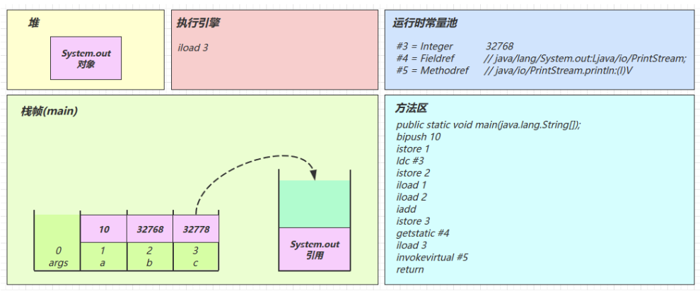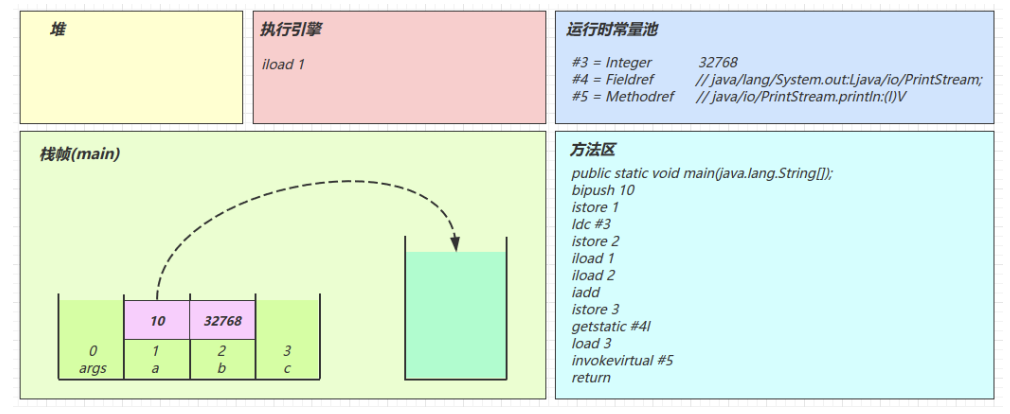 2.3 图解方法执行流程 1)原始 java 代码 1 2 3 4 5 6 7 8 9 10 11 public class Demo3_1 { public static void main (String[] args) { int a = 10 ; int b = Short.MAX_VALUE + 1 ; int c = a + b; System.out.println(c); } }