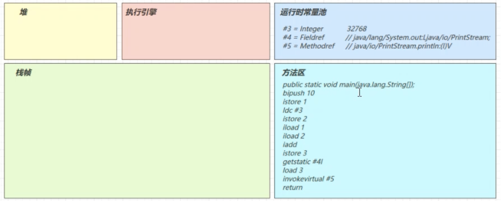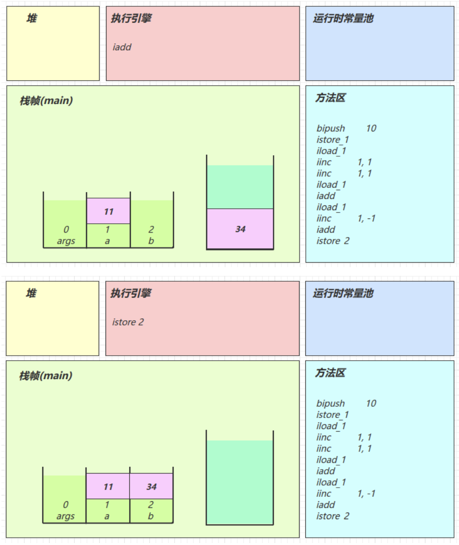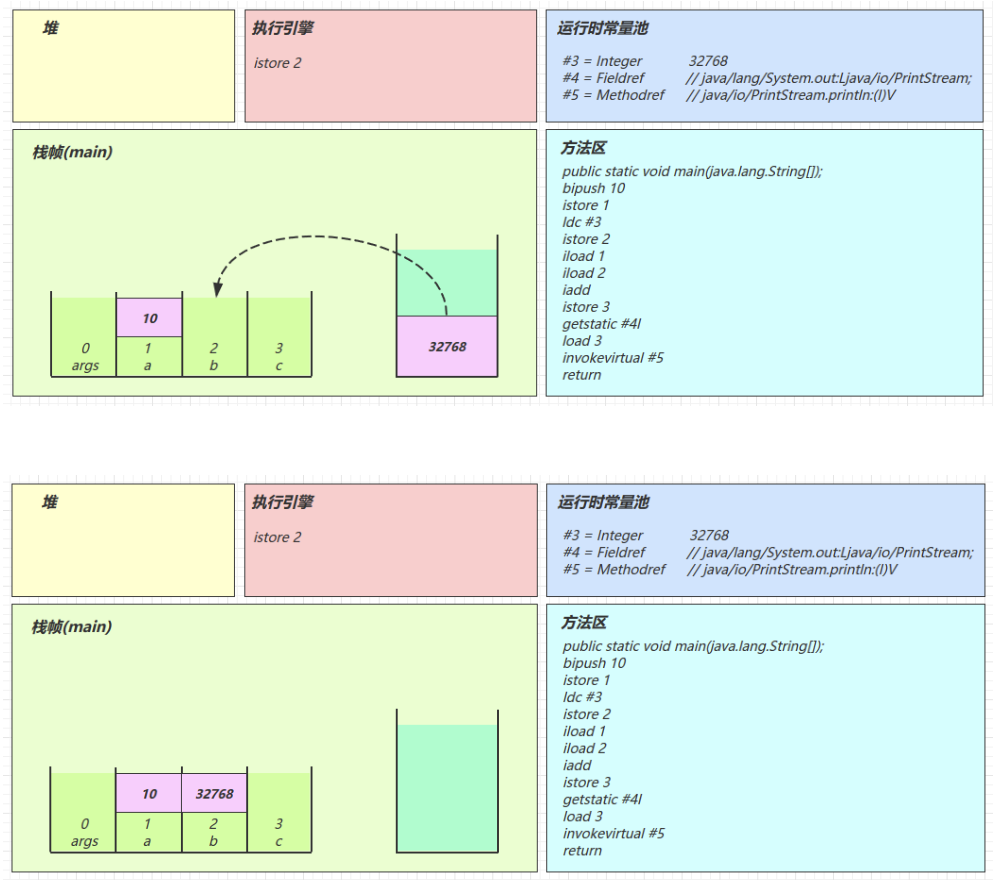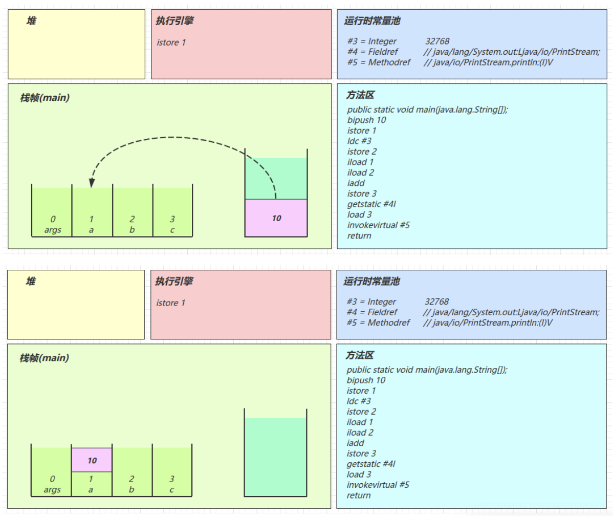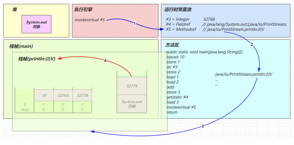2.3 图解方法执行流程 1)原始 java 代码 1 2 3 4 5 6 7 8 9 10 11 public class Demo3_1 { public static void main (String[] args) { int a = 10 ; int b = Short.MAX_VALUE + 1 ; int c = a + b; System.out.println(c); } }