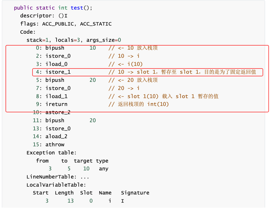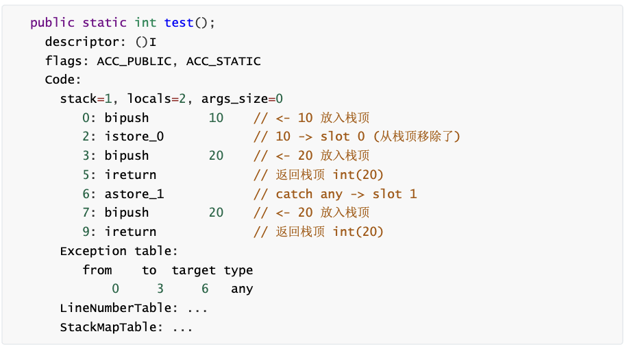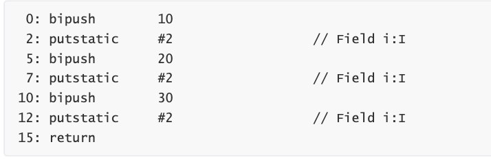 bipush 10:把10 压入栈 (10是short范围内的数,直接保存在字节码指令)