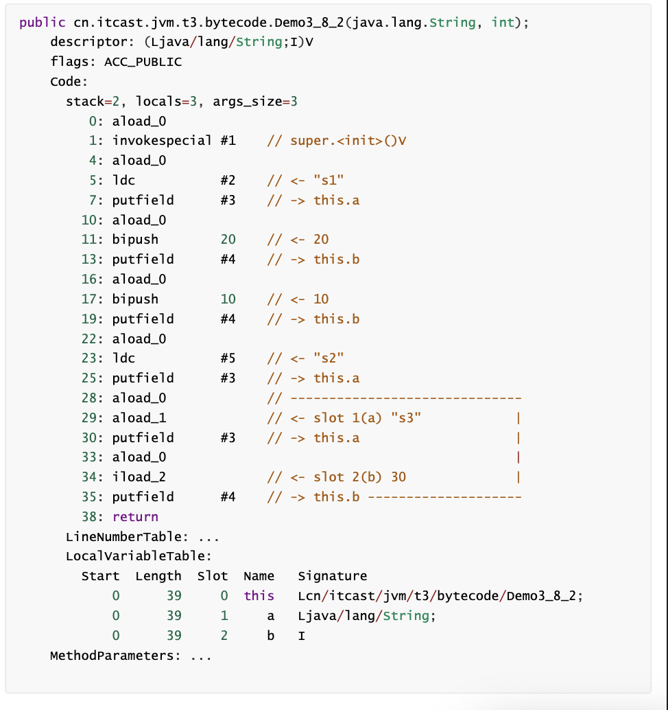 1 2 3 4 5 6 7 8 9 10 11 12 13 14 15 16 17 18 19 20 21 22 23 24 25 26 27 28 29 30 31 32 33 34 35 36 37 38 39 40 41 42 43 44 45 46 47 48 49 50 51 52 53 54 55 56 57 58 59 60 61 62 63 64 65 66 67 68 69 70 71 72 73 74 75 76 77 78 79 80 81 82 83 84 85 86 87 88 89 90 91 92 93 94 Classfile /Users/cyt/workspace/java/jvm-std/jvm/src/cn/itcast/jvm/t3/bytecode/Demo3_2.class Last modified 2025-11-1; size 610 bytes MD5 checksum 5f6a35e5b9bb88d08249958a8d2ab043 Compiled from "Demo3_2.java" public class cn.itcast.jvm.t3.bytecode.Demo3_2 minor version: 0 major version: 52 flags: ACC_PUBLIC, ACC_SUPER Constant pool: # 1 = Methodref # 2 = Fieldref # 3 = Methodref # 4 = Class # 5 = Class # 6 = Utf8 <init> # 7 = Utf8 ()V # 8 = Utf8 Code # 9 = Utf8 LineNumberTable # 10 = Utf8 LocalVariableTable # 11 = Utf8 this # 12 = Utf8 Lcn/itcast/jvm/t3/bytecode/Demo3_2; # 13 = Utf8 main # 14 = Utf8 ([Ljava/lang/String;)V # 15 = Utf8 args # 16 = Utf8 [Ljava/lang/String; # 17 = Utf8 a # 18 = Utf8 I # 19 = Utf8 b # 20 = Utf8 SourceFile # 21 = Utf8 Demo3_2.java # 22 = NameAndType # 23 = Class # 24 = NameAndType # 25 = Class # 26 = NameAndType # 27 = Utf8 cn/itcast/jvm/t3/bytecode/Demo3_2 # 28 = Utf8 java/lang/Object # 29 = Utf8 java/lang/System # 30 = Utf8 out # 31 = Utf8 Ljava/io/PrintStream; # 32 = Utf8 java/io/PrintStream # 33 = Utf8 println # 34 = Utf8 (I)V { public cn.itcast.jvm.t3.bytecode.Demo3_2(); descriptor: ()V flags: ACC_PUBLIC Code: stack=1, locals=1, args_size=1 0: aload_0 1: invokespecial #1 // Method java/lang/Object."<init>":()V 4: return LineNumberTable: line 6: 0 LocalVariableTable: Start Length Slot Name Signature 0 5 0 this Lcn/itcast/jvm/t3/bytecode/Demo3_2; public static void main(java.lang.String[]); descriptor: ([Ljava/lang/String;)V flags: ACC_PUBLIC, ACC_STATIC Code: stack=2, locals=3, args_size=1 0: bipush 10 2: istore_1 3: iload_1 4: iinc 1, 1 7: iinc 1, 1 10: iload_1 11: iadd 12: iload_1 13: iinc 1, -1 16: iadd 17: istore_2 18: getstatic #2 // Field java/lang/System.out:Ljava/io/PrintStream; 21: iload_1 22: invokevirtual #3 // Method java/io/PrintStream.println:(I)V 25: getstatic #2 // Field java/lang/System.out:Ljava/io/PrintStream; 28: iload_2 29: invokevirtual #3 // Method java/io/PrintStream.println:(I)V 32: return LineNumberTable: line 8: 0 line 9: 3 line 10: 18 line 11: 25 line 12: 32 LocalVariableTable: Start Length Slot Name Signature 0 33 0 args [Ljava/lang/String; 3 30 1 a I 18 15 2 b I } SourceFile: "Demo3_2.java"