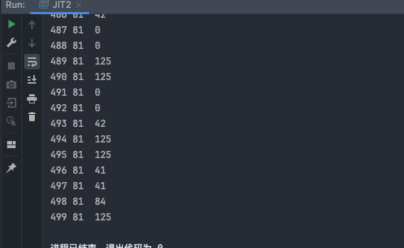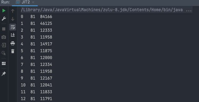 1 2 3 4 5 6 7 8 9 10 11 12 13 14 public class JIT1 { public static void main (String[] args) { for (int i = 0 ; i < 200 ; i++) { long start = System.nanoTime(); for (int j = 0 ; j < 1000 ; j++) { new Object (); } long end = System.nanoTime(); System.out.printf("%d\t%d\n" ,i,(end - start)); } } }