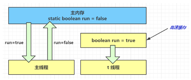 - 1 秒之后,main 线程修改了 run 的值,并同步至主存,而 t 是从自己工作内存中的高速缓存中读 取这个变量的值,结果永远是旧值
