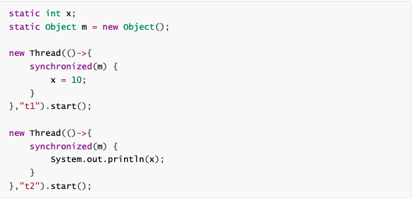 - 线程解锁 m 之前对变量的写,对于接下来对 m 加锁的其它线程对该变量的读可见