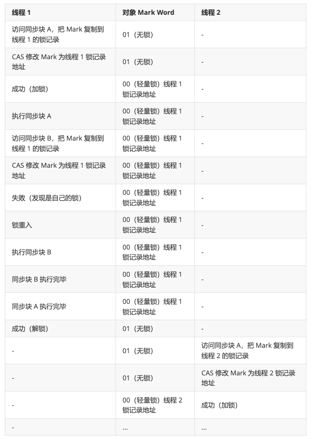 轻量级锁在没有竞争时(就自己这个线程),每次重入仍然需要执行 CAS 操作。Java 6 中引入了偏向锁 来做进一步优化:只有第一次使用 CAS 将线程 ID 设置到对象的 Mark Word 头,之后发现这个线程 ID 是自己的就表示没有竞争,不用重新 CAS.