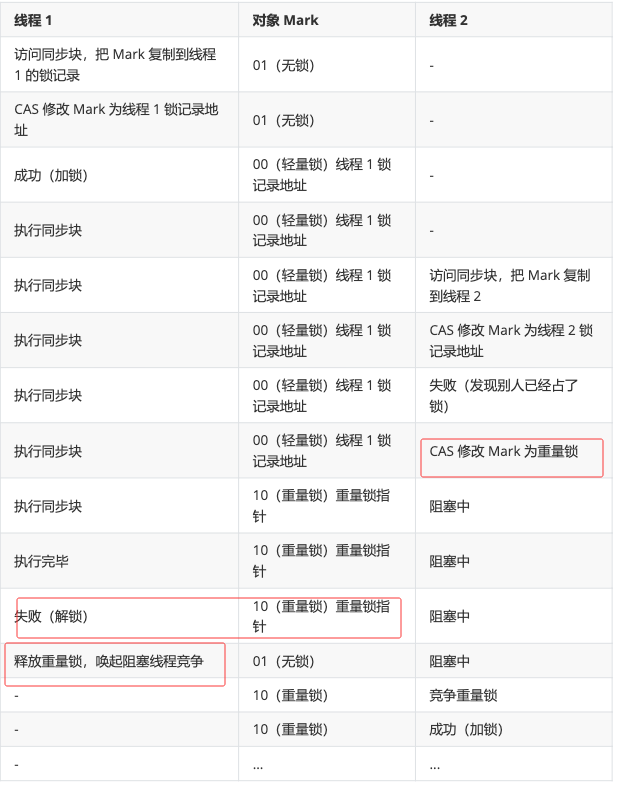 如果这期间有其它学生(线程 B)来了,会告知(线程A)有并发访问,线程 A 随即升级为重量级锁, 进入重量级锁的流程。