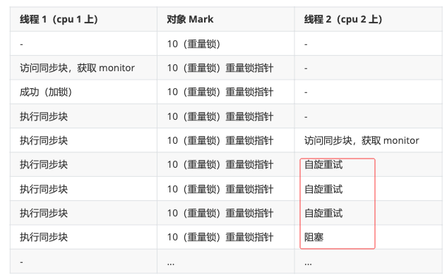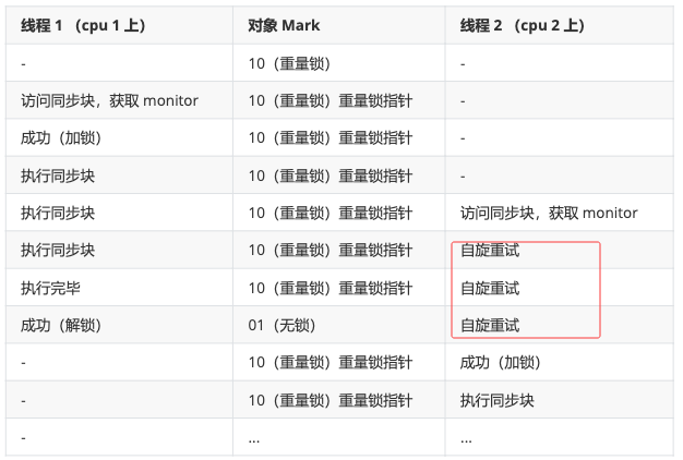 重量级锁竞争的时候,还可以使用自旋来进行优化,如果当前线程自旋成功(即这时候持锁线程已经退 出了同步块,释放了锁),这时当前线程就可以避免阻塞。 在 Java 6