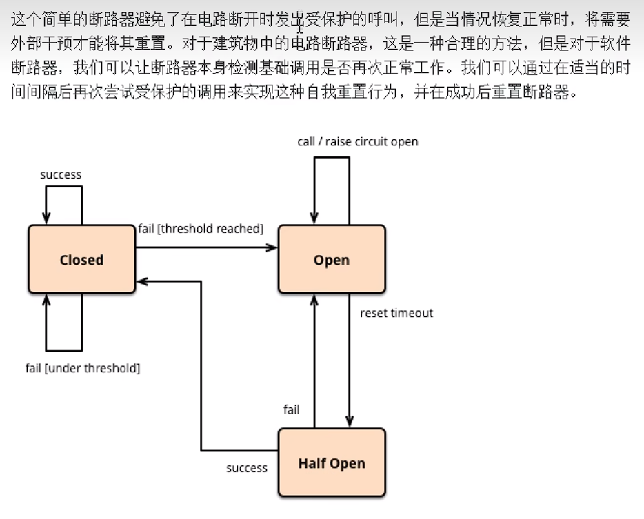 1 2 3 4 5 6 7 8 9 10 11 12 13 14 15 16 17 18 19 20 21 @HystrixCommand(fallbackMethod = "paymentCircuitBreaker_fallback",commandProperties = { @HystrixProperty(name = "circuitBreaker.enabled",value = "true"),// 是否开启断路器 @HystrixProperty(name = "circuitBreaker.requestVolumeThreshold",value = "10"),// 请求次数 @HystrixProperty(name = "circuitBreaker.sleepWindowInMilliseconds",value = "10000"), // 时间窗口期 @HystrixProperty(name = "circuitBreaker.errorThresholdPercentage",value = "60"),// 失败率达到多少后跳闸 }) public String paymentCircuitBreaker (@PathVariable("id") Integer id) { if (id < 0 ) { throw new RuntimeException ("******id 不能负数" ); } String serialNumber = IdUtil.simpleUUID(); return Thread.currentThread().getName()+"\t" +"调用成功,流水号: " + serialNumber; } public String paymentCircuitBreaker_fallback (@PathVariable("id") Integer id) { return "id 不能负数,请稍后再试,/(ㄒoㄒ)/~~ id: " +id; }